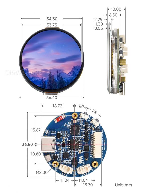 The ESP32-C6-Touch-AMOLED-1.32 is a compact 1.32inch HD AMOLED capacitive touch display development board designed by Waveshare. It has onboard power management module, low power audio codec circuit, and MIC, adapting 12PIN expansion I/O interface, Lithium battery header, and speaker header, suitable for applications such as AI voice agents.