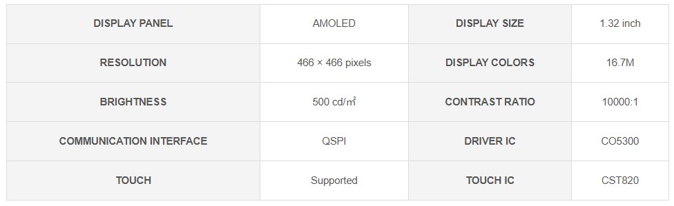 - Embedded with CO5300 driver chip and CST820 capacitive touch chip, communicating through QSPI and I2C interfaces respectively, minimizes required IO pins