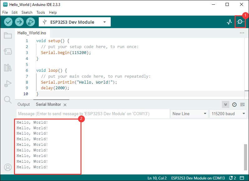 - Open the Serial Monitor window, and the demo will print "Hello World!" every 2 seconds, and the operation is as follows: