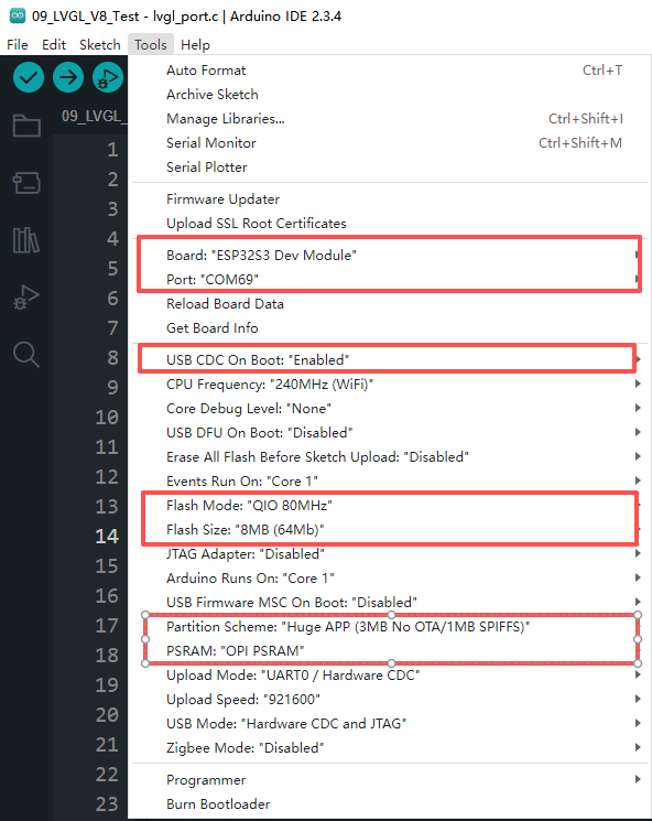 - If the ESP32S3 mainboard only has a USB port, you need to enable USB CDC, as shown in the following diagram: