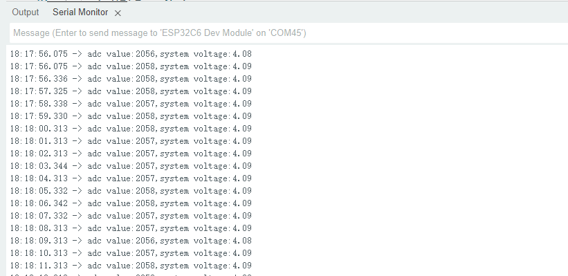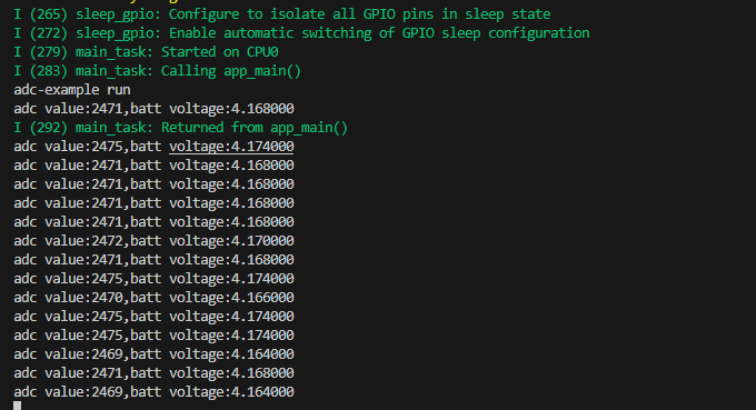 - The analog voltage connected through the GPIO is converted to digital by the ADC, and then the actual lithium battery voltage is calculated and printed to the terminal.