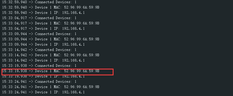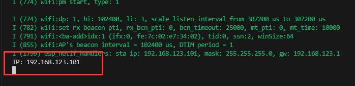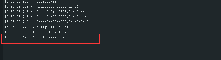 After flashing the program, open the serial terminal, if the device is successfully connected to the hotspot, the MAC address and IP address of the device will be output, as shown in the figure: