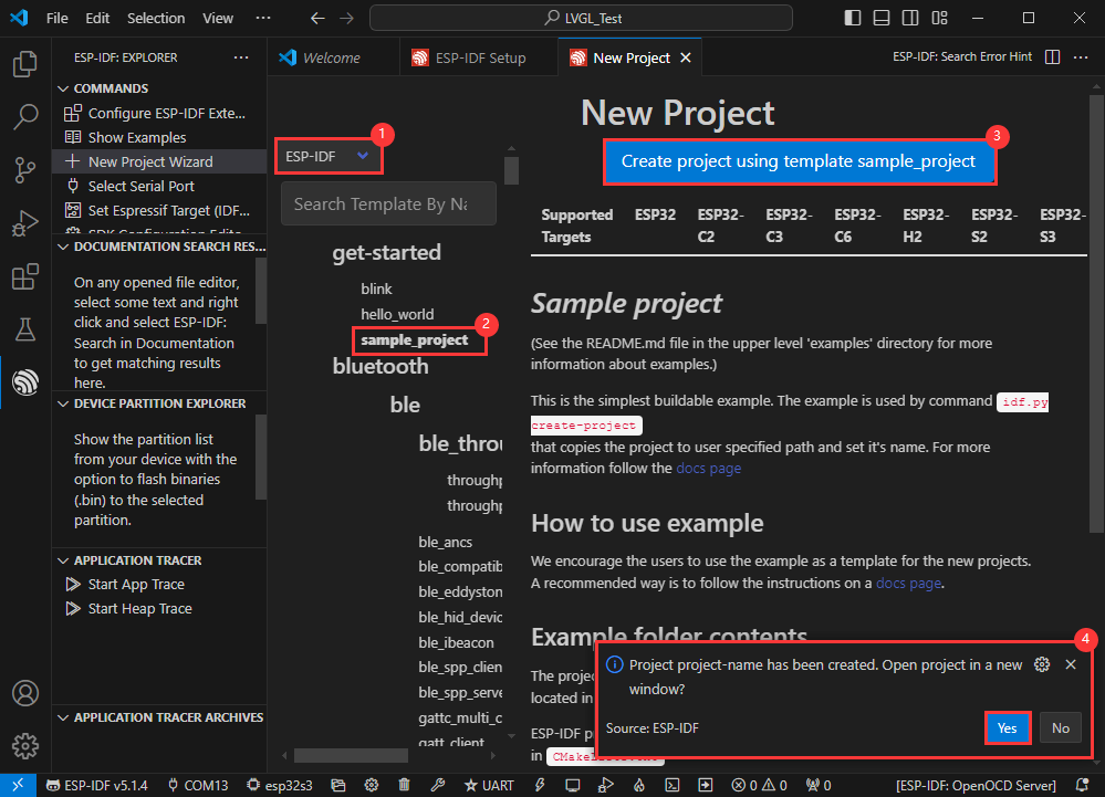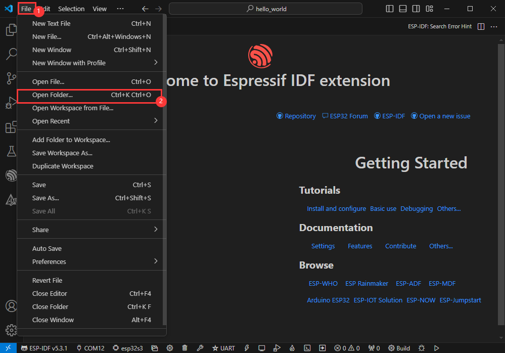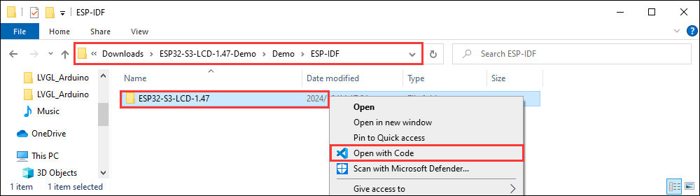 The following takes ESP32-S3-LCD-1.47-Demo as an example to introduce the two opening methods of the project and the general steps of use, and the detailed explanation of the ESP-IDF project. If you use other projects, the operation steps can be applied similarly.
