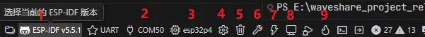 When opening an ESP-IDF project, the environment will be loaded automatically at the bottom. For the development of ESP32-P4-WIFI6-Touch-LCD-3.5, the bottom toolbar is very important, as shown in the figure:
