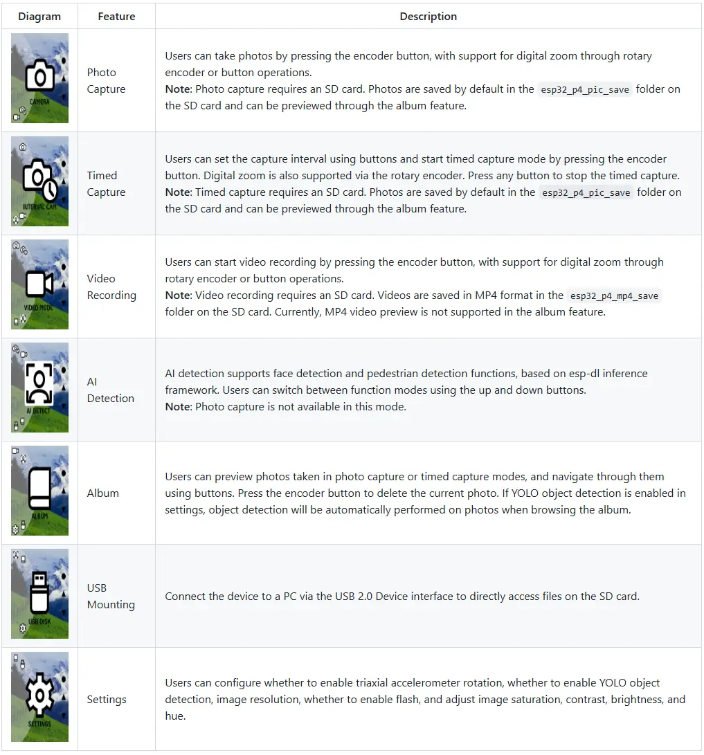 1. Photo Capture Press the encoder button to take a photo. Supports digital zoom via knob rotation or button presses. Photos are saved by default to the esp32_p4_pic_save folder on the TF card and can be viewed in the album.