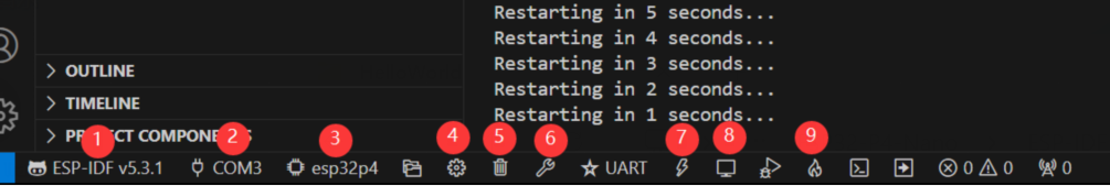 After understanding the explanation of the VS Code user interface bottom toolbar, the Hello World project allows for a quick start and understanding of the basic project structure of the ESP32 development environment. It demonstrates how to use ESP-IDF to create a basic application and covers the ESP32 development process, including compilation, flashing, and monitor debugging steps.