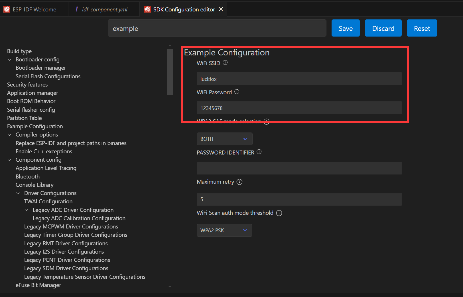 idf_component.yml file will appear in the main folder of the project. As explained in the ESP‑IDF project directory section, this file is used to manage project components.espressif/esp_hosted: "1.4.*" and espressif/esp_wifi_remote: "0.14.*". These components will be included in the project during the build process.Next, click the to open the settings. Search for Example and set the ssid and password of the Wi-Fi you want to connect to. **Note: The ESP32‑C6 supports 2.4 GHz Wi‑Fi 6. When selecting the target Wi-Fi, ensure the frequency is 2.4GHz. **After modifying the settings, remember to save them; otherwise, errors may occur.