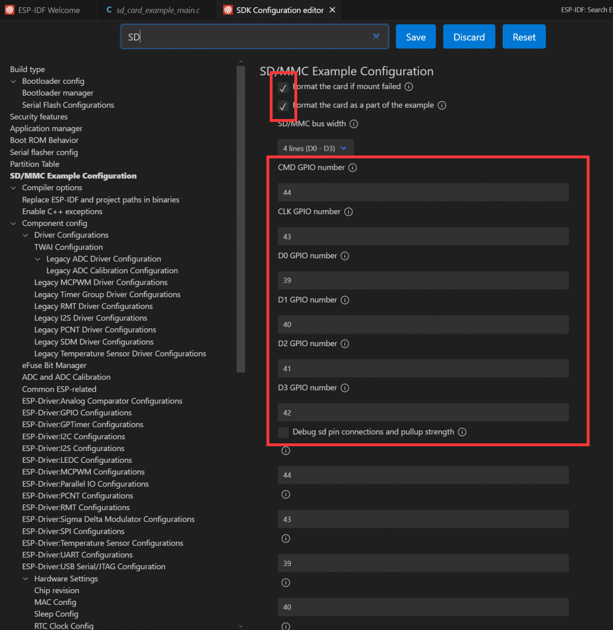Open the SDMMC project, select the appropriate COM port and chip model. Since the demo project defines the pins as macros, they need to be configured here; alternatively, you can directly enter the pin numbers. Click button to enter the settings. This will open a new tab: SDK Configuration editor, also known as menuconfig. In the search bar, type sd to find the relevant configuration. The example settings are already prepared. Enable the option for default initialization and ensure the example file is created by default.