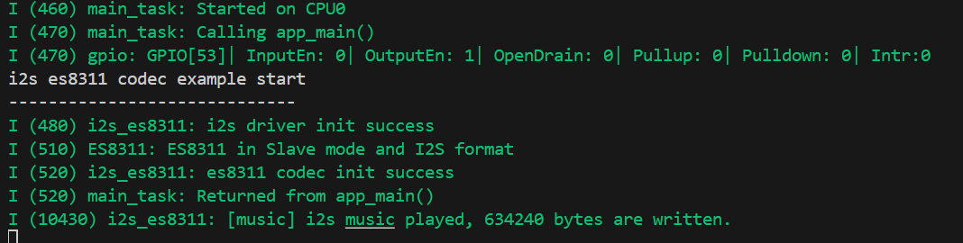 Connect a speaker, you can directly compile, flash, and monitor by clicking. After completion, you will see the following result in the terminal, indicating that the ESP32-P4-WIFI6-Touch-LCD-4.3 is now playing audio: