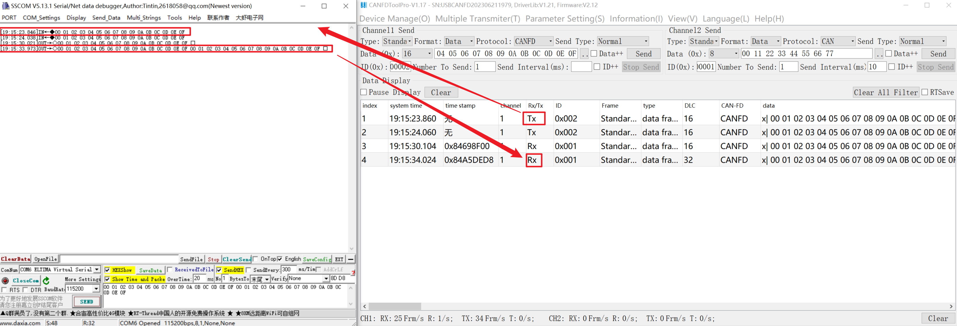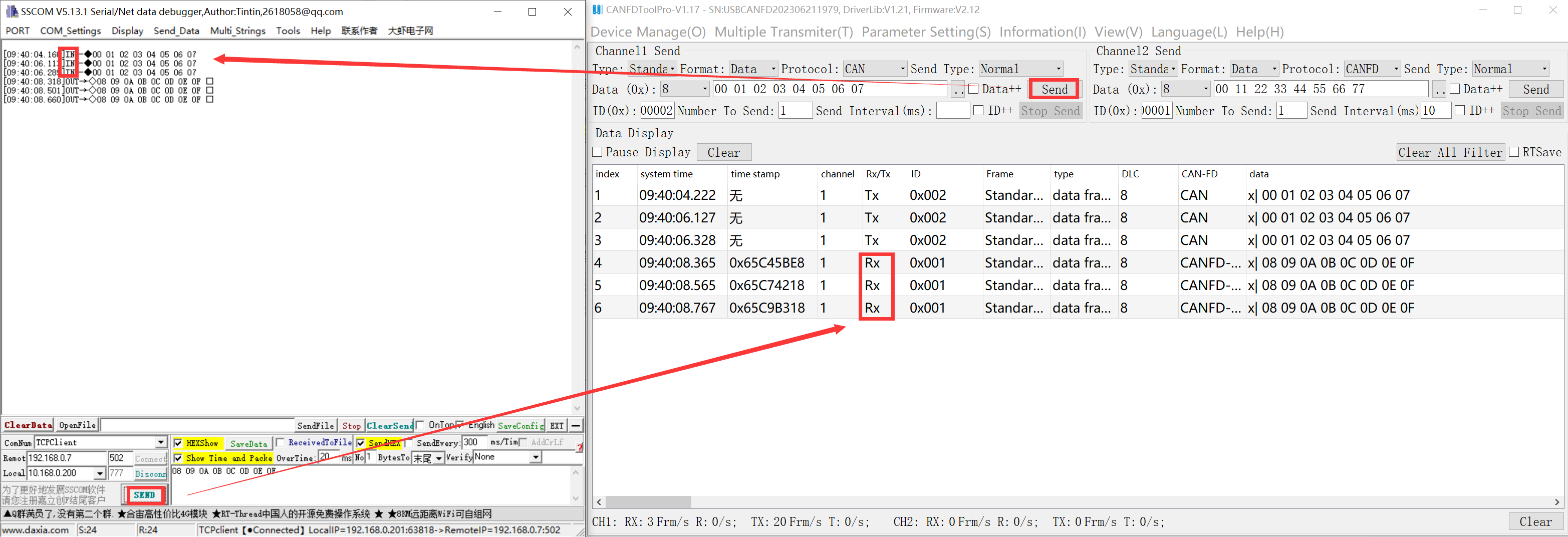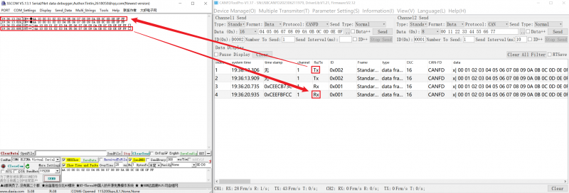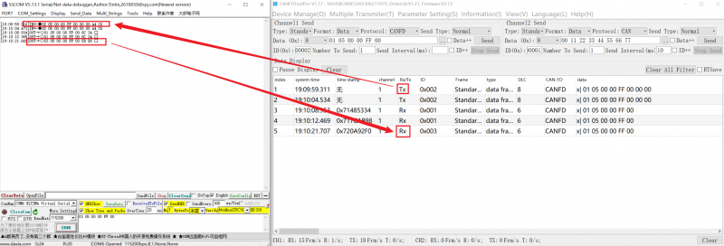 CAN to Serial Port data (enable frame information/enable frame ID not enabled) CANFD to Serial Port data (enable frame information/enable frame ID enabled)