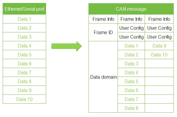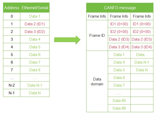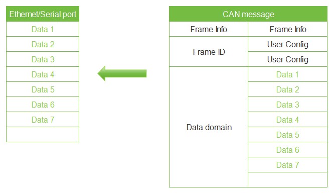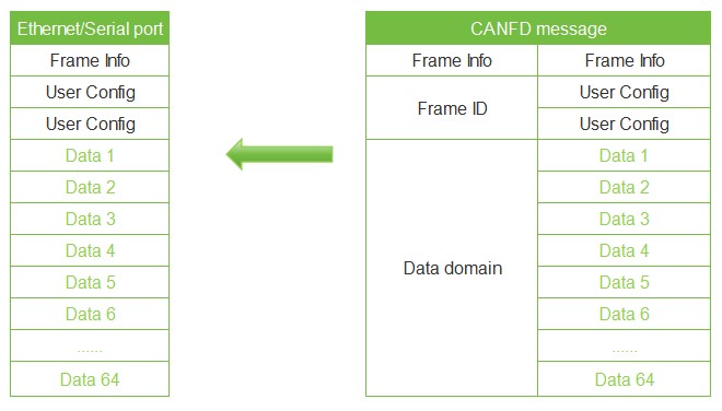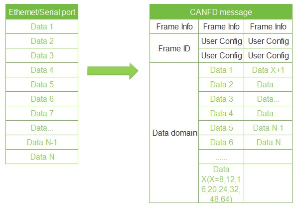 The CAN(FD) bus message forwards one frame for every frame received. The module will sequentially convert the data in the CAN message data field, while automatically adding frame header, frame length, frame information, and other data to the serial frame. This is essentially the reverse form of converting a serial frame to a CAN message.