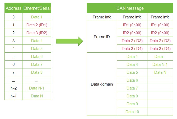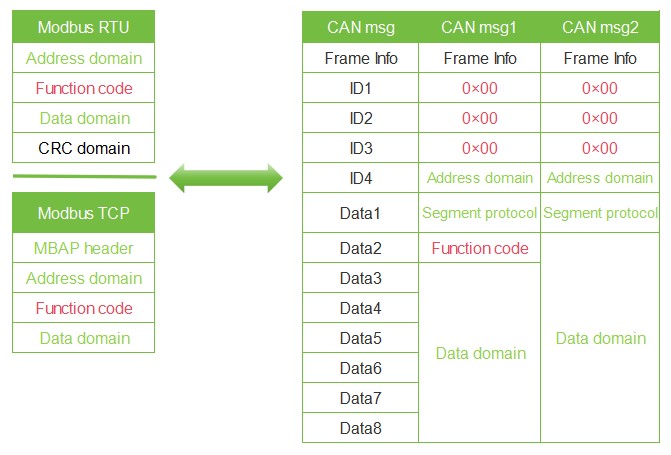 The address field of the Modbus protocol is converted into the ID4 (extended frame) or ID2 (standard frame) of the frame ID in the CAN message, and the identifier remains unchanged during the conversion of this frame.