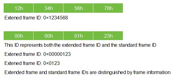 Frame ID: 4 bytes long; high byte first, low byte last. The standard frame has 11 valid bits, and the extended frame has 29 valid bits.