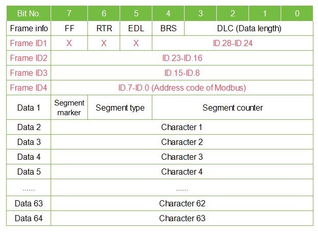 In CANFD mode, the transmitted Modbus protocol content can start from the "Data 2" byte. If the protocol content is greater than 63 bytes, then the remaining protocol content will continue to be converted according to this segmented format until the conversion is completed.
