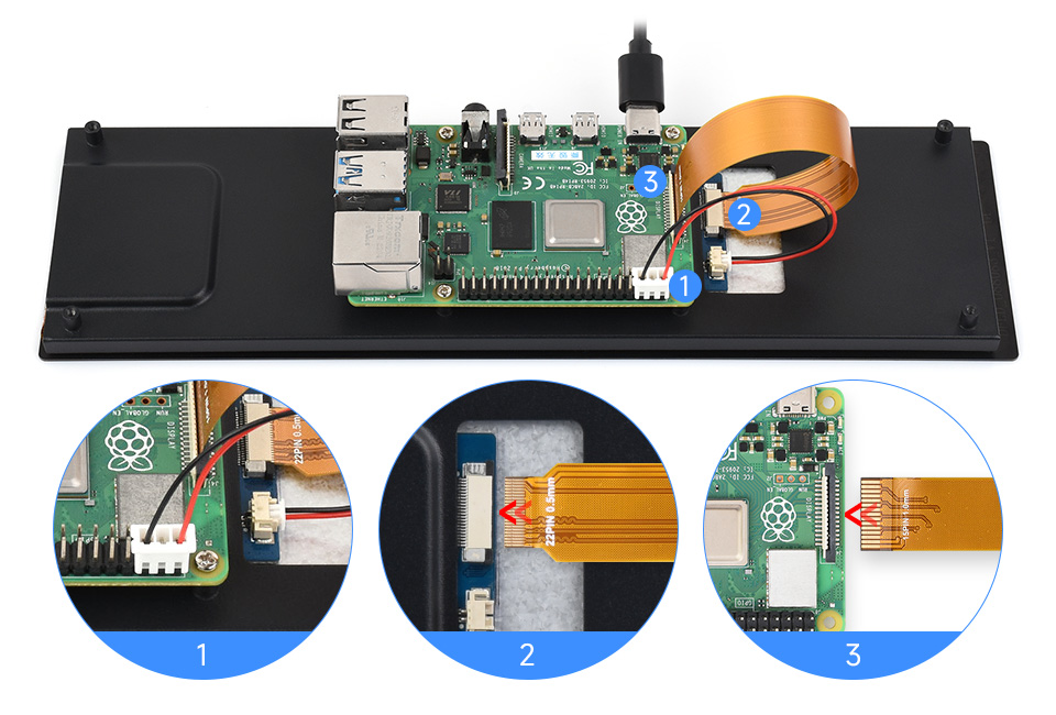 1. Use an FFC cable (22PIN, 200mm, reversed) to connect the DSI port of the display to the 22PIN DSI port of the Raspberry Pi motherboard.
