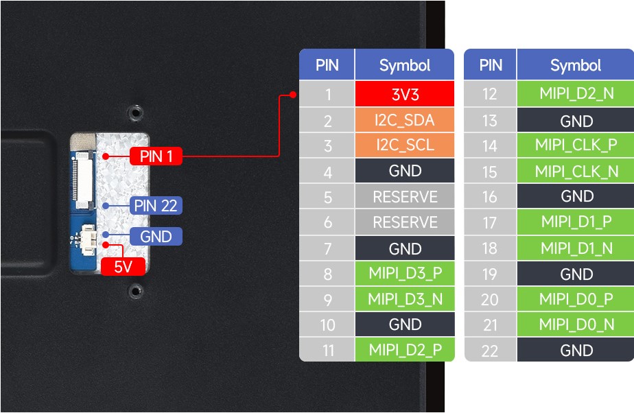 1. Use the "FFC Cable 22PIN 200mm (opposite direction)" to connect the DSI port of the display to the 22PIN DSI port of the Raspberry Pi motherboard. 2. Use the "GPIO cable" to connect the power connector of the display to the 5V GND pin header of the Raspberry Pi motherboard.