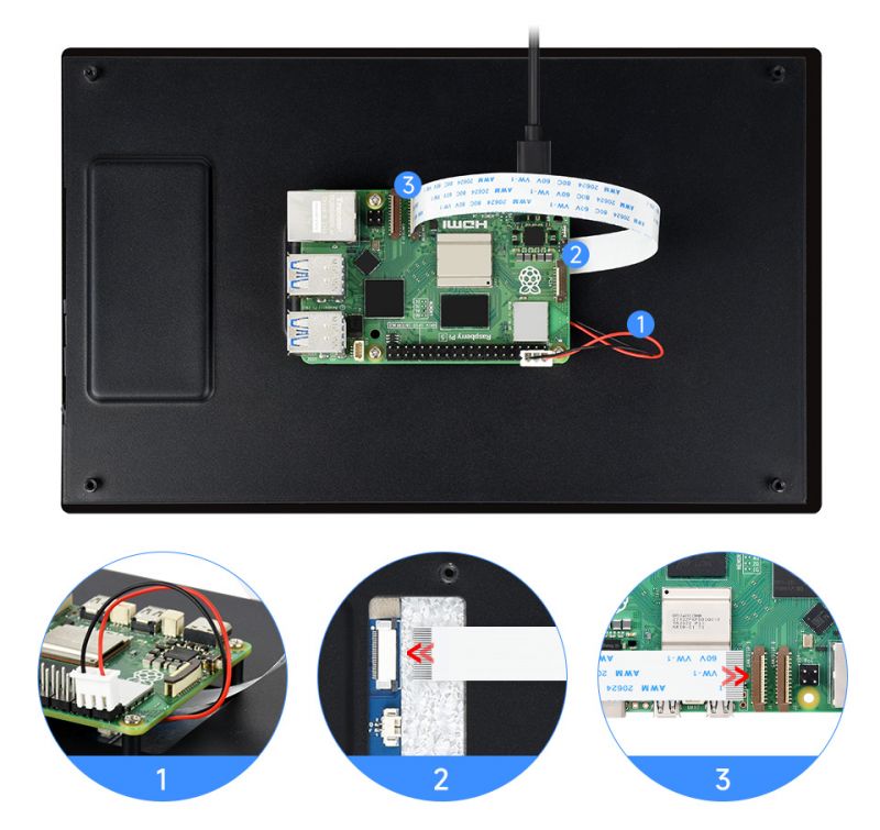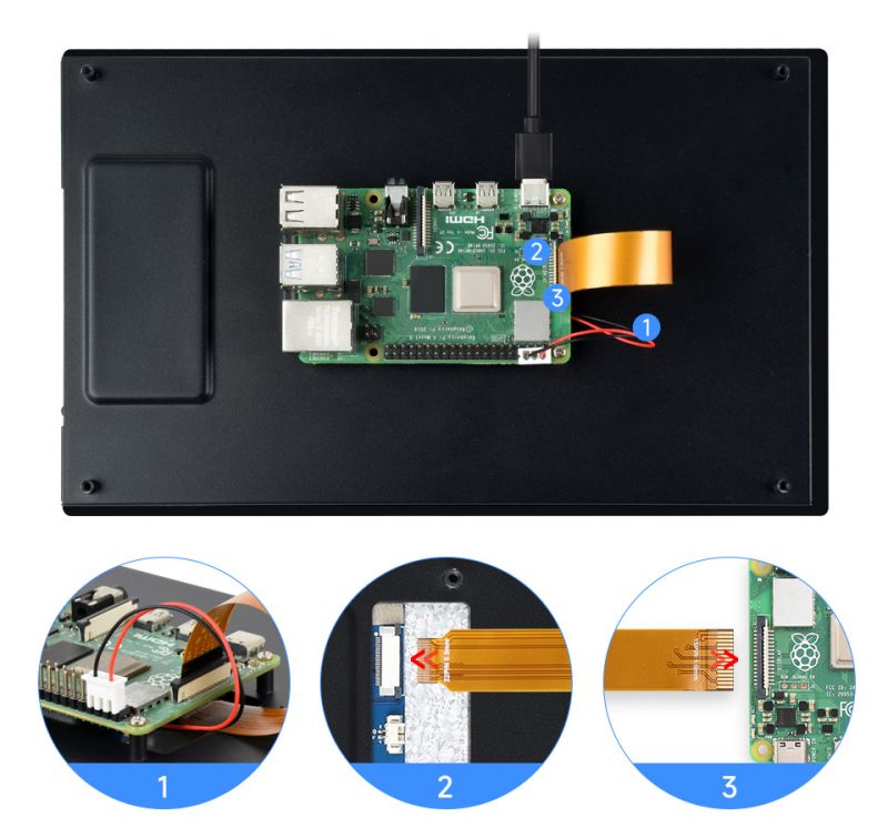 1. Use the "DSI-Cable-12cm" cable to connect the DSI port of the display to the 15PIN DSI port of the Raspberry Pi motherboard. 2. Use the "GPIO cable" to connect the power connector of the display to the 5V GND pin header of the Raspberry Pi motherboard.