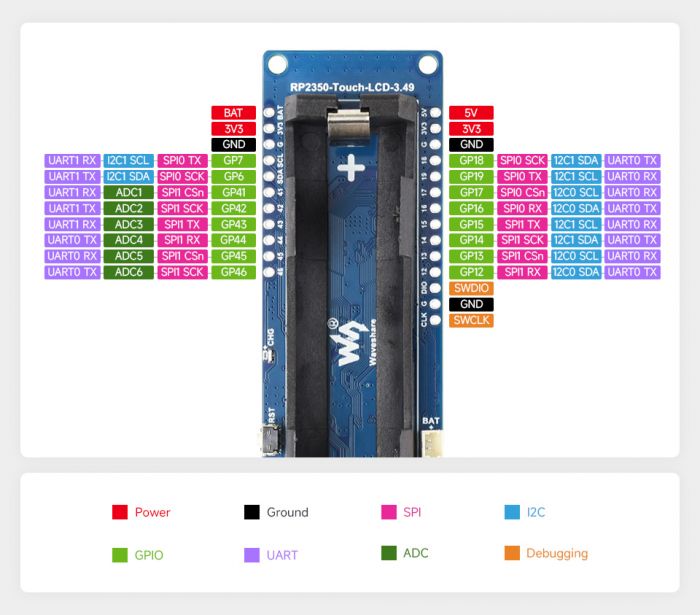 This product is a high-performance, highly integrated microcontroller development board designed by Waveshare. It is equipped with a 3.49inch capacitive high-definition IPS screen, a highly integrated power management chip, a 6-axis IMU (3-axis accelerometer and 3-axis gyroscope), RTC, low-power audio codec chip, TF card slot and other peripherals, which are convenient for development and embedding into the product.