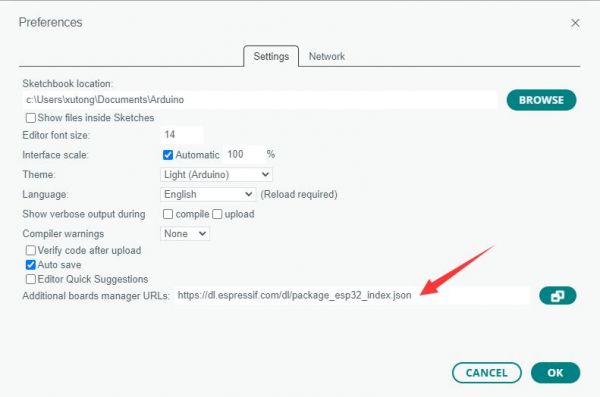 Note: If you already have an ESP32 board URL, you can use a comma to separate the URLs as follows: