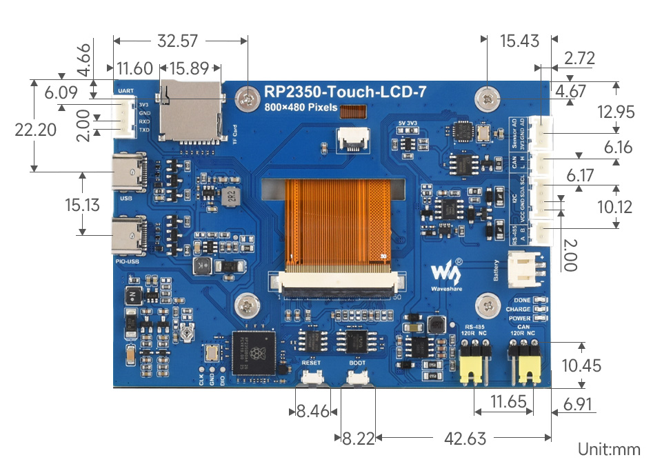 This product is a high-performance, highly integrated microcontroller development board independently designed by Waveshare. In a smaller board size, the board is equipped with a 7inch capacitive HD LCD screen, PIO-USB, TF card slot and other peripherals, making it easy to develop and embed into products.